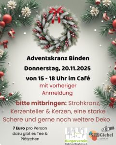 - Adventskranzbinden am 20.11.2025, 15.00 – 18.00 Uhr im Bürgercafé